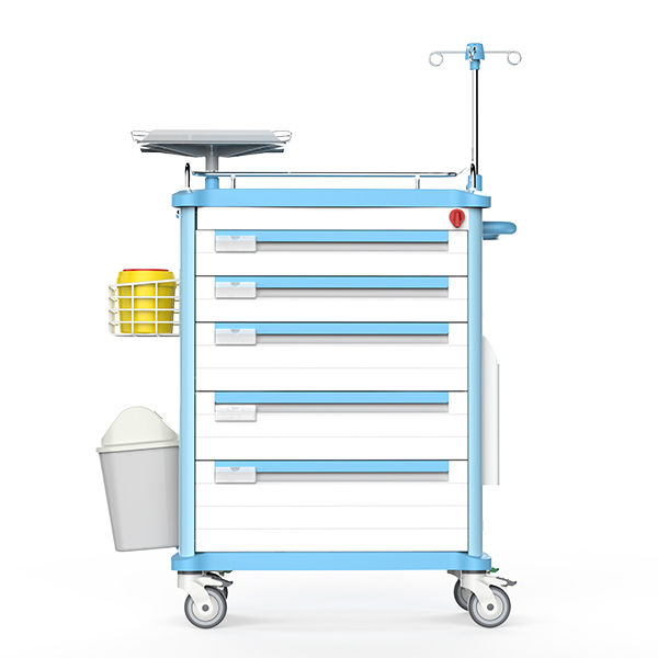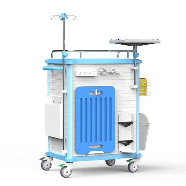 7. The trolley back is equipped with cardiopulmonary resuscitation board, power socket, and a fast-rotating ABS tray. The side trash can be easily removed.