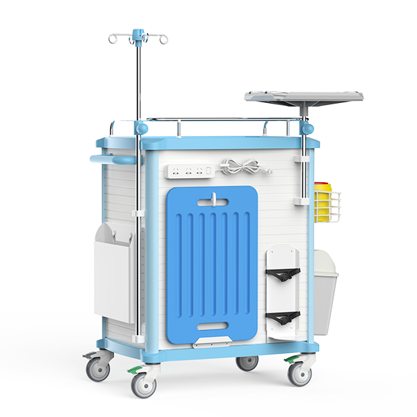 7. The trolley back is equipped with cardiopulmonary resuscitation board, power socket, and a fast-rotating ABS tray. The side trash can be easily removed.