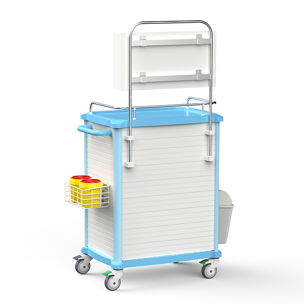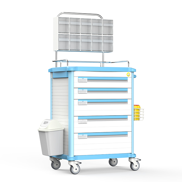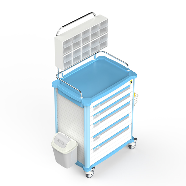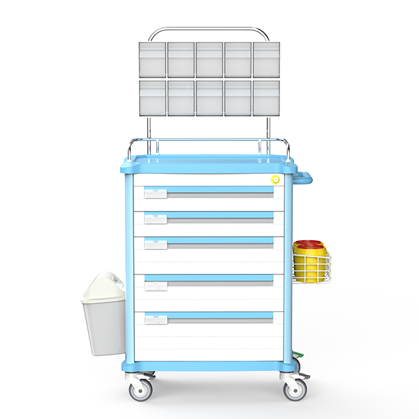 3. Configuration: Drawers use heavy-duty 1.2/1.2/1.5MM thickness three-section silent rail; two shallow medicine boxes and three deep medicine boxes, internal free inserts; maximum space 20 compartments, the entire pill-box can be easily taken out; Double-layer five connected anti-bucket transparent anesthetic kit with transparent label frame; pull-type ABS sub-workbench extended the work surface; trash can in one side can be easily removed; ABS Pushing hand and disinfectant sharp barrel basket are at table side.