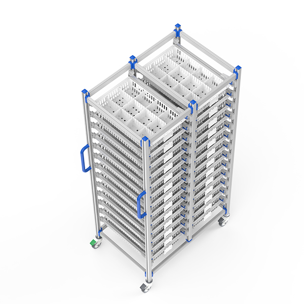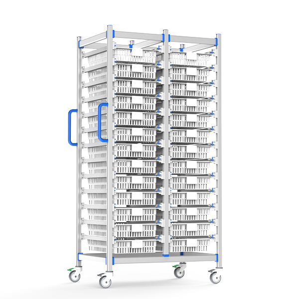 Medical-grade anodized aluminum frame with silent mobility system. Features 360° self-correcting wheels, modular ISO baskets, anti-bacterial surfaces, and height-adjustable push handle. Customizable for global healthcare workflows.