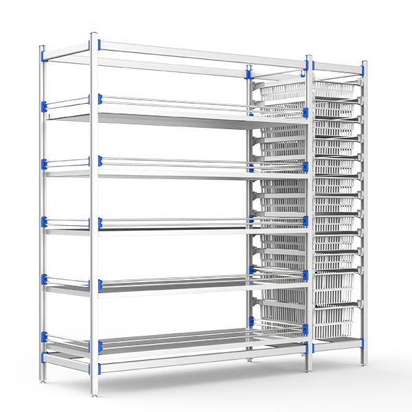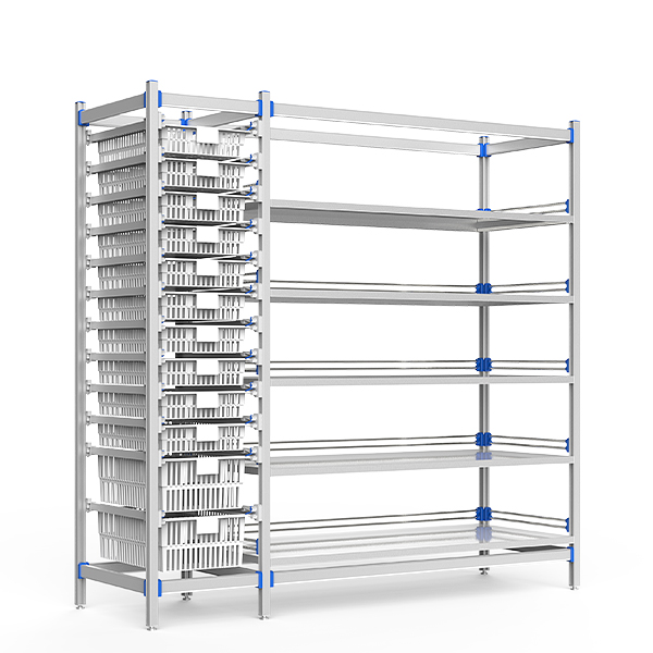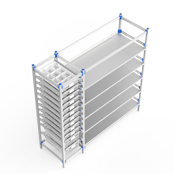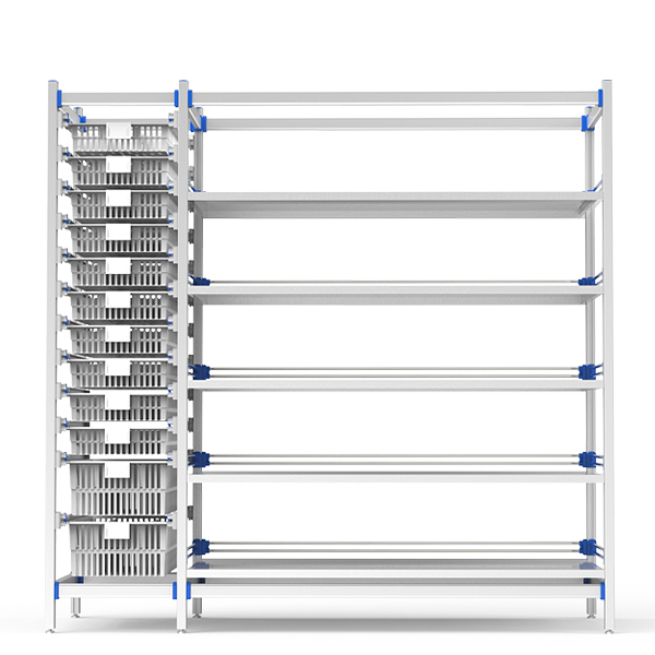 Designed for hospital central supply and pharmaceutical storage requiring high-density organization. Modular baskets safely store bulk consumables, while adjustable shelves and leveling system ensure stability in large-scale facilities.
