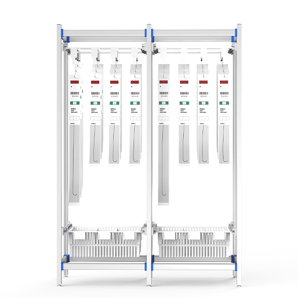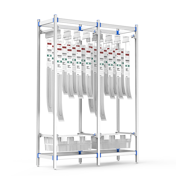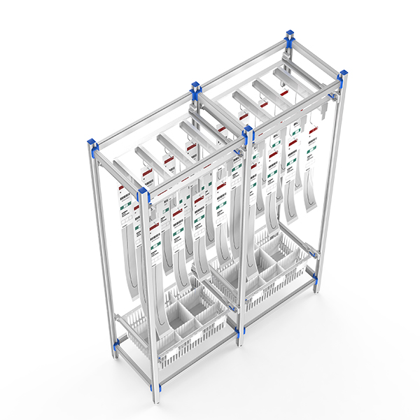 Medical-grade aluminum frame with 24-tier stainless steel hooks (8 columns × 3 tiers). Features ISO modular baskets, ±20mm self-leveling feet, and ergonomic tilt-slide access. Customizable for global interventional suite workflows.