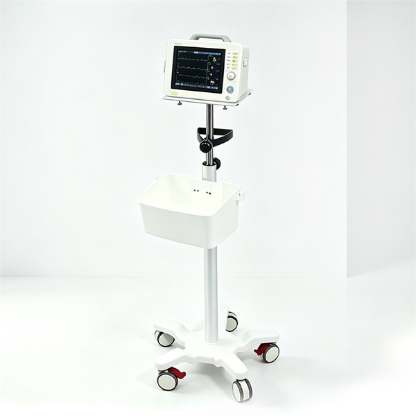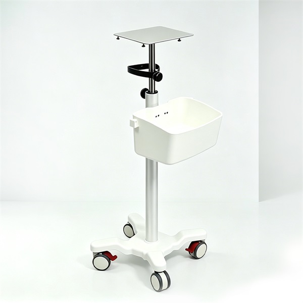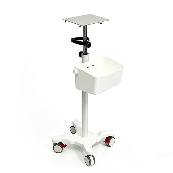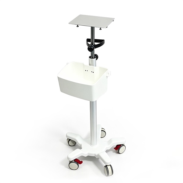 Lightweight aluminum alloy platform (255×165mm). Adjustable height from 900-1400mm. 5 medical casters (2 with brakes) for stability. PP base cover + internal steel frame. Integrated 300×190×180mm storage basket. Net weight: 7kg.