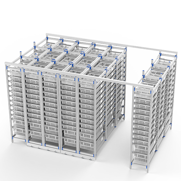 Modular ISO basket system with high-capacity aluminum frame and double-sided mobile structure. Micro-tilted basket access, flexible divider setup, and multi-angle label frames support high-efficiency inventory retrieval and SPD integration.
