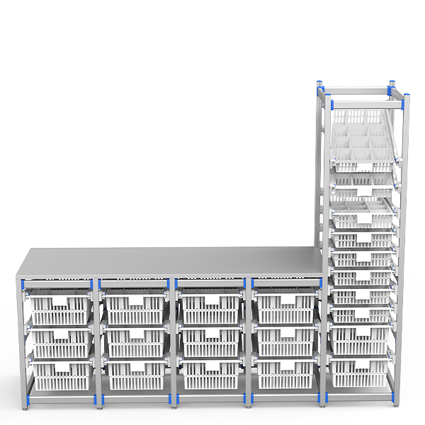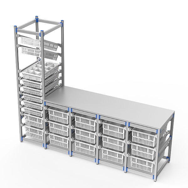 Modular treatment station built with a seamless anodized aluminum frame and a fully reinforced stainless steel top ensures high load capacity and easy maintenance. ISO 600×400mm ventilated baskets support dynamic storage with adjustable dividers. Labeling frames on both external and internal sides improve item retrieval speed. Stainless steel leveling feet enable stable deployment across uneven floors. Designed for high-frequency clinical operations with durable structure and ergonomic access.