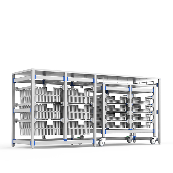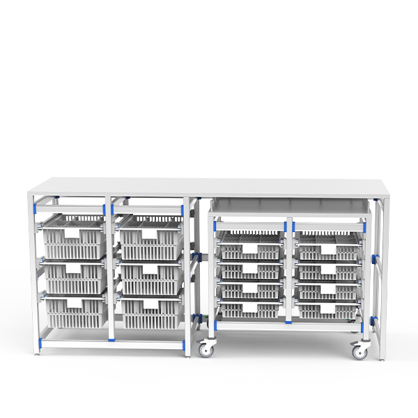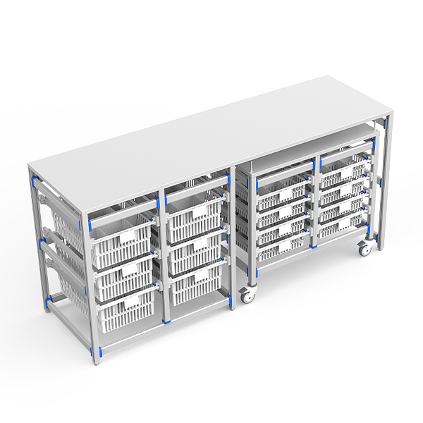 Constructed with high-strength anodized aluminum and a seamless frame, this modular workstation integrates a full-size medical cart that can operate independently or nest within the main unit. ISO 600×400mm baskets provide flexible storage with adjustable dividers and dual labeling options. Stainless steel top with railings ensures flatness, stability, and safety, while medical-grade casters enable smooth maneuvering across clinical environments.