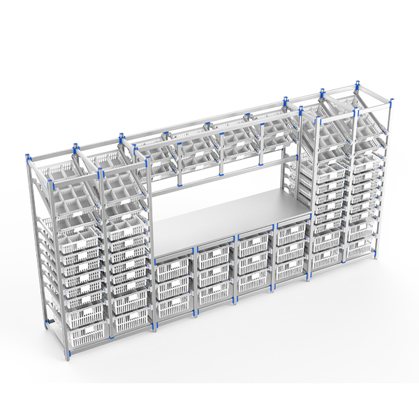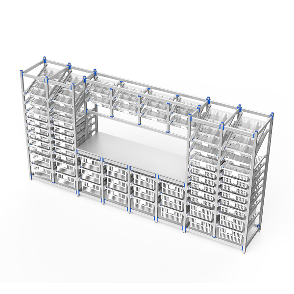 Large-capacity modular treatment station with a reinforced 304 stainless steel worktop and anodized aluminum frame. Supports both ISO 600×400mm and 400×300mm basket systems for flexible, cross-compatible storage. Ventilated baskets with adjustable dividers and dual labeling improve organization and access speed. Closed-frame design ensures hygiene and durability. Adjustable stainless steel leveling feet allow precise stability in clinical environments.