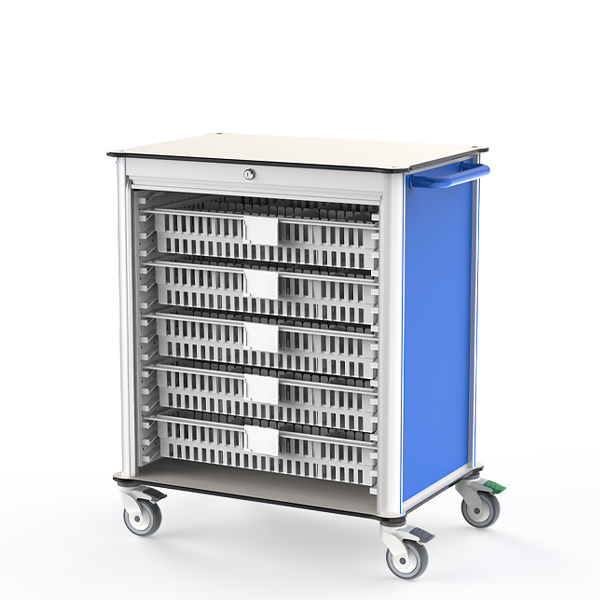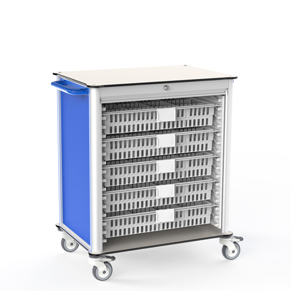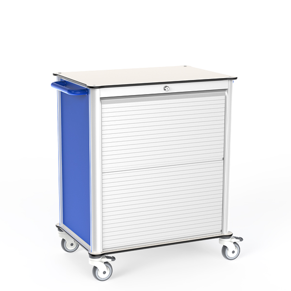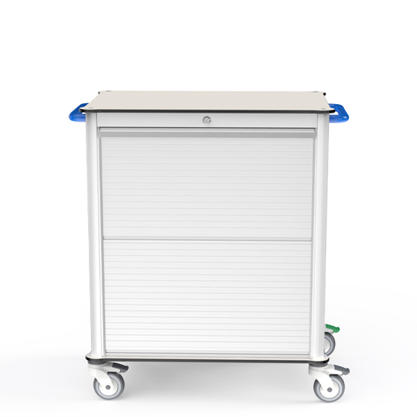 Dual 8mm HPL countertops with high-strength aluminum frame provide stability and lightweight performance. ABS roll-up doors allow secure closure and efficient access. ISO 600×400mm modular baskets with dual labeling frames enable organized storage and fast retrieval. Silent medical-grade casters and ergonomic ABS handles ensure smooth mobility.ISO quality system and CE certification guarantee safety and reliability.