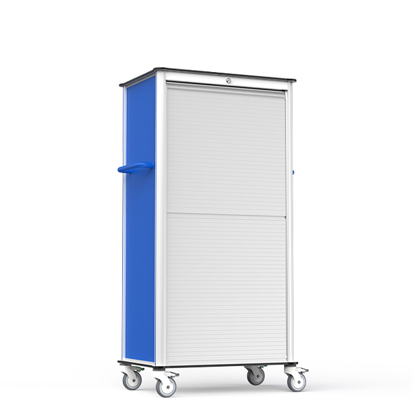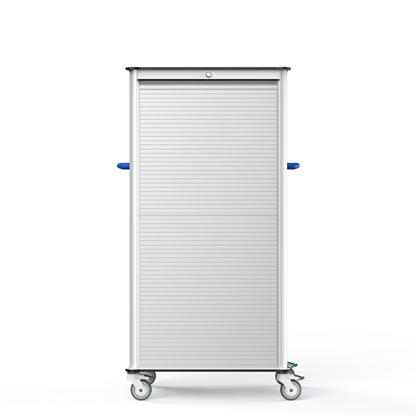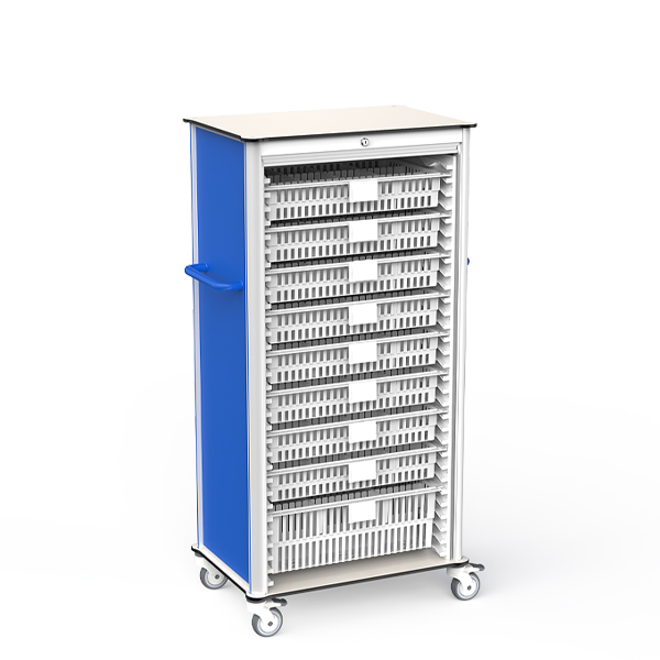 Dual 8mm HPL countertops with full aluminum alloy frame provide stability and corrosion resistance. ABS roll-up doors allow secure closure and quick access. ISO 600×400mm modular baskets with dual labeling frames ensure organized storage and fast retrieval.