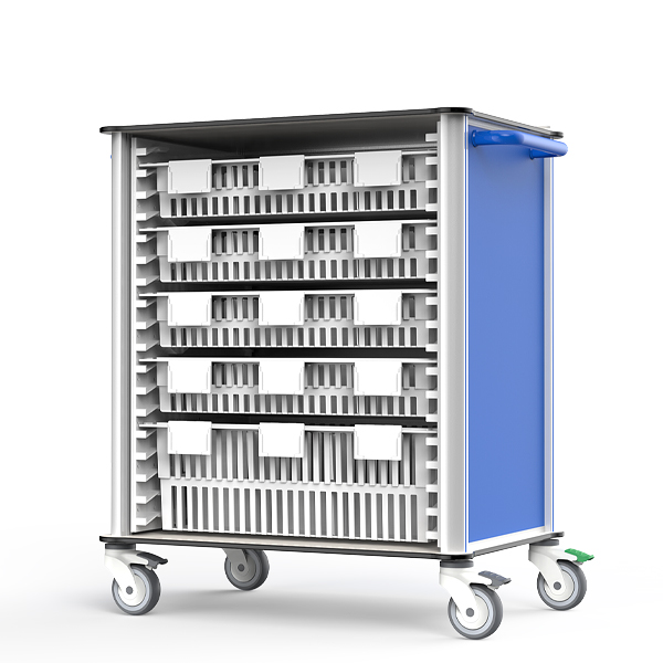 High-strength aluminum alloy frame with dual 8mm HPL countertops provides lightweight stability and durability. ISO 600×400mm modular baskets with multi-track rails and adjustable dividers allow organized storage and quick access. Multi-dimensional labeling system and silent casters enable smooth mobility. ISO quality system and CE certification ensure safety and reliability.