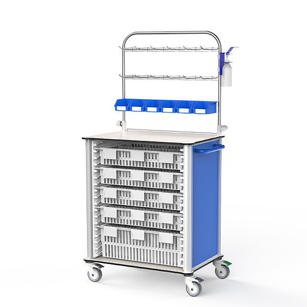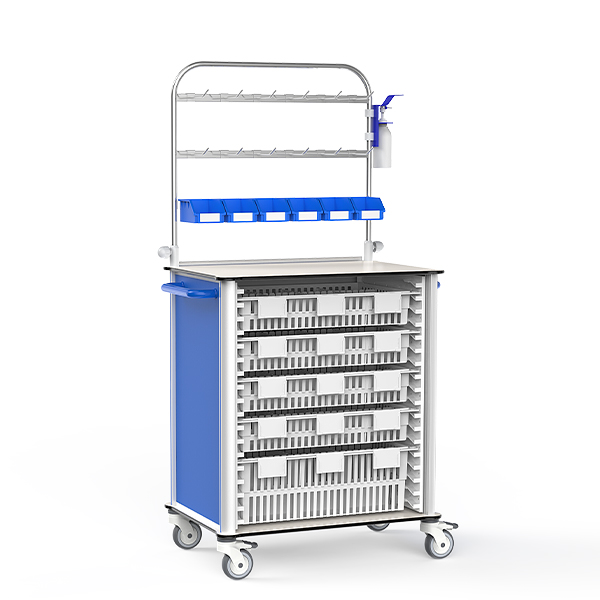 The CE- and ISO-certified trolley combines an aluminum alloy frame with 8mm HPL compact countertops for excellent stability, corrosion resistance, and easy cleaning.Its modular ISO 600×400mm basket system with dual labeling enables efficient classification and fast access.The upper stainless IV rack supports multiple solution bags, while the elbow-operated sanitizer holder and detachable utility boxes enhance hygiene and workflow safety.Equipped with ergonomic ABS handles and medical-grade silent casters, it offers smooth, stable mobility with refined design and clinical precision.