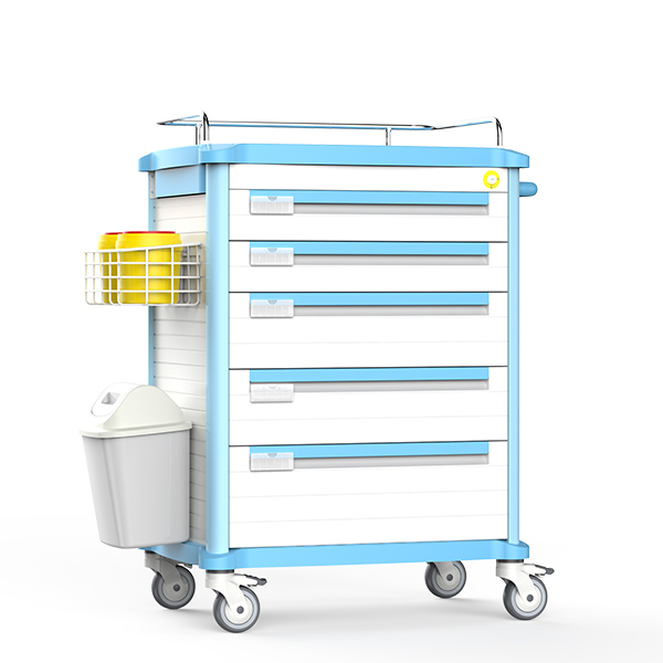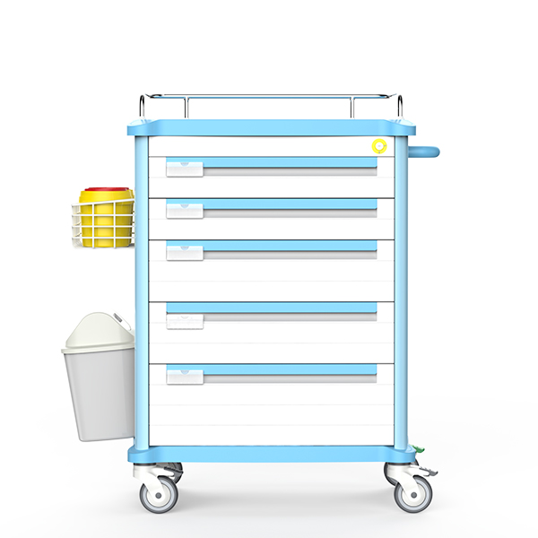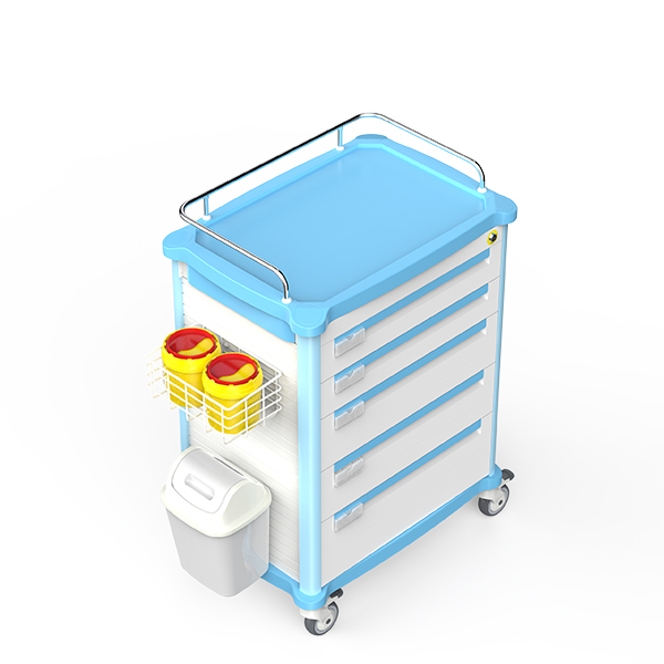 5. ABS dispensing medicine trolley is equipped with central security lock, ABS pushing handle, disinfectant sharpener barrel basket. It’s equipped with trash box at side, which can be easily removed.